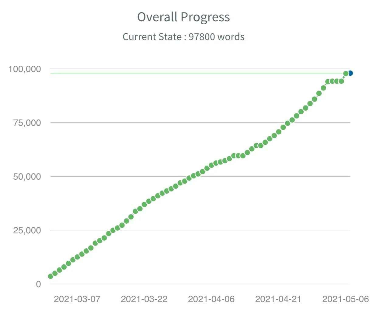 Now that’s more like it! There are days of hefty progress, and days where I barely move the needle. And there are days when I don’t write a single word because I’ve printed the whole book out and I’m reading it straight through. I find I have to do that at least twice a book, because it’s hard to hold the narrative arc in your head.